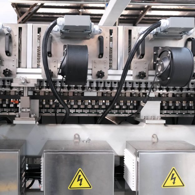 Un manipulador especial entrega las preformas calentadas a los moldes siguiendo una determinada curva de levas. Tras el pre-soplado por estiramiento, la preforma se sopla para convertirla en botella mediante la conexión de aire comprimido a alta presión. Un manipulador especial envía la botella terminada siguiendo una determinada curva de levas.